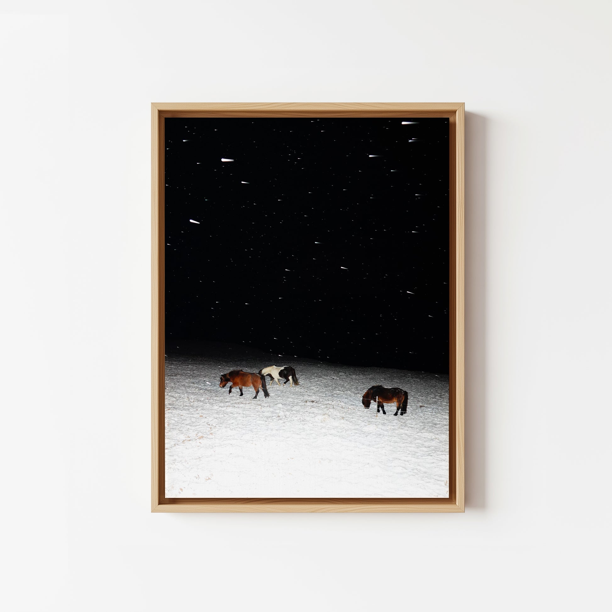 The next night, drawn by that dream, I returned to them in the pitch-black of Siglufjörður, the fjord stretching endlessly behind them. The world was silent, the air thick with snow, and in that moment of perfect stillness, I took this photograph. The horses seemed to float, their forms shifting between reality and something more ethereal.