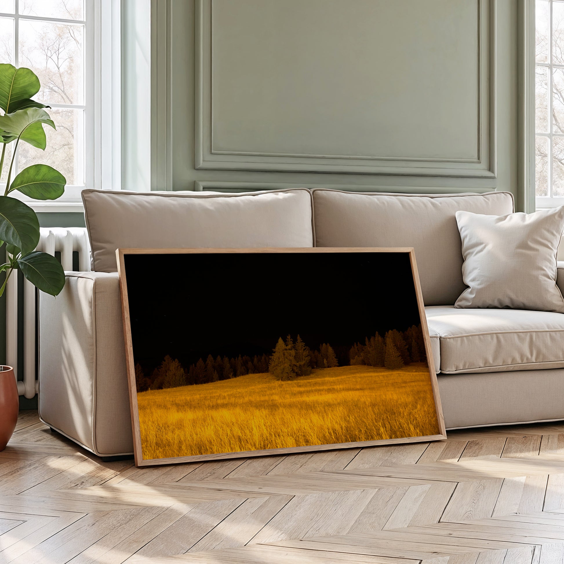 Each canvas is stretched and framed in natural oak wood, a clear and luminous material that carries warmth and elegance. The oak makes every place feel radiant, filled with beauty, emotion, and light. The deep colors and textures of the canvas breathe like a painting, creating an atmosphere that feels alive around you.
